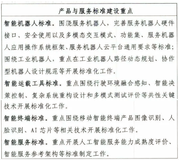 到2021年,明確人工智能標(biāo)準(zhǔn)化頂層設(shè)計(jì),研究標(biāo)準(zhǔn)體系建設(shè)和標(biāo)準(zhǔn)研制的總體規(guī)則,明確標(biāo)準(zhǔn)之間的關(guān)系,指導(dǎo)人工智能標(biāo)準(zhǔn)化工作的有序開(kāi)展,完成關(guān)鍵通用技術(shù)、關(guān)鍵領(lǐng)域技術(shù)、倫理等20項(xiàng)以上重點(diǎn)標(biāo)準(zhǔn)的預(yù)研工作。