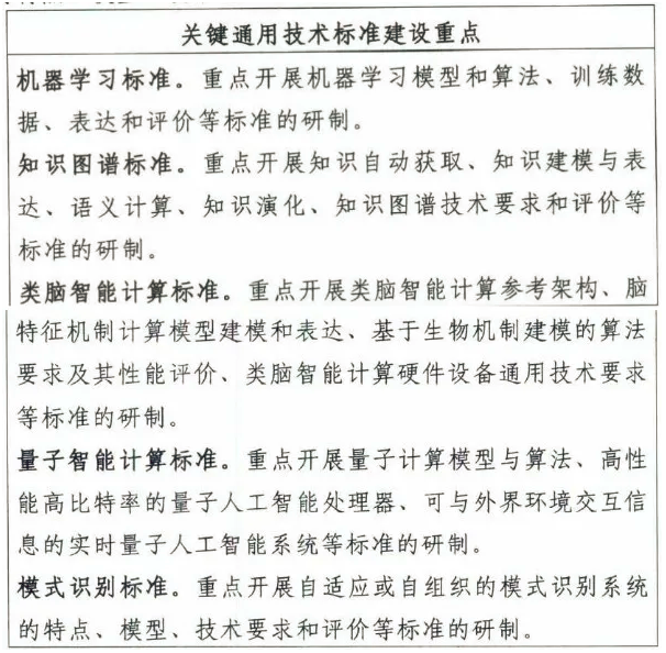 D關(guān)鍵通用技術(shù)標(biāo)準(zhǔn)主要圍繞機(jī)器學(xué)習(xí)、知識(shí)圖譜、類腦智能計(jì)算、量子智能計(jì)算、模式識(shí)別等方面,為人工智能應(yīng)用提供通用技術(shù)支撐;