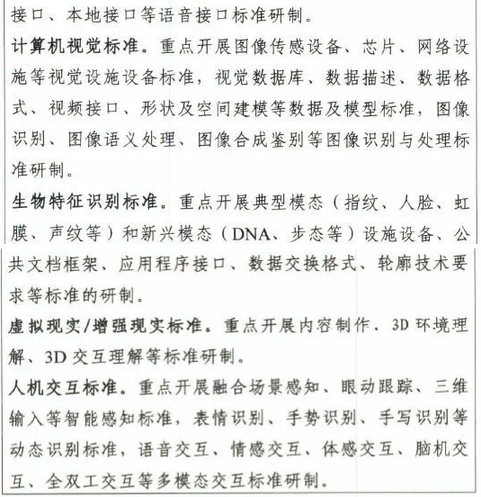 關(guān)鍵領(lǐng)域技術(shù)標(biāo)準(zhǔn)主要包括自然語(yǔ)言處理、智能語(yǔ)音、計(jì)算機(jī)視覺(jué)、生物特征識(shí)別、虛擬現(xiàn)實(shí)/增強(qiáng)現(xiàn)實(shí)、人機(jī)交互等部分,如圖7所示。
