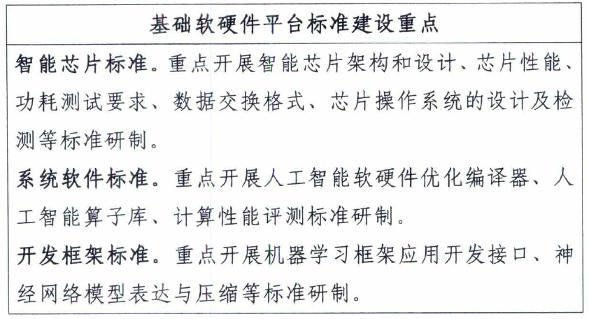 1.智能芯片標(biāo)準(zhǔn)。規(guī)范智能計(jì)算芯片、新型感知芯片及相關(guān)底層接口等,為人工智能模型的訓(xùn)練和推理提供算力支持。包括指令集和虛擬指令集、芯片性能、功耗測(cè)試要求、數(shù)據(jù)交換格式、芯片操作系統(tǒng)的設(shè)計(jì)及檢測(cè)等標(biāo)準(zhǔn)。