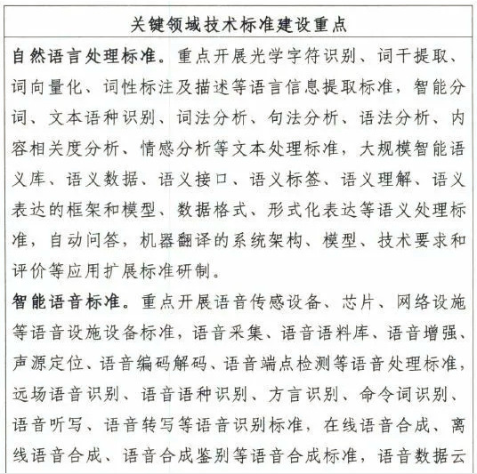 2.智能語(yǔ)音標(biāo)準(zhǔn)。規(guī)范人機(jī)語(yǔ)言通信的技術(shù)和方法,確保語(yǔ)音識(shí)別、語(yǔ)音合成及其應(yīng)用的準(zhǔn)確性、一致性、高效性和可用性。智能語(yǔ)音標(biāo)準(zhǔn)包括語(yǔ)音設(shè)施設(shè)備、語(yǔ)音處理、語(yǔ)音識(shí)別、語(yǔ)音合成、語(yǔ)音接口五個(gè)部分。