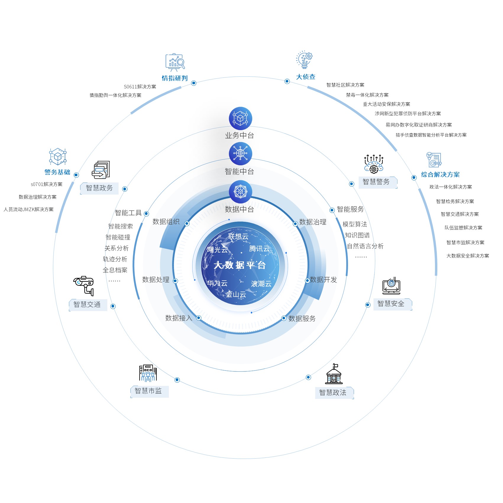 以政法委為核心,致力于為公、檢、法、司等全政法系統(tǒng)提供數(shù)智服務(wù),打造集政法信息資源共享、政法協(xié)同、部門辦案、專項(xiàng)信息、政法大數(shù)據(jù)等于一體的“政法大腦”,通過(guò)政法大數(shù)據(jù)分析,準(zhǔn)確把握?qǐng)?zhí)法司法運(yùn)行態(tài)勢(shì),科學(xué)調(diào)配執(zhí)法司法資源,提高決策科學(xué)化、精準(zhǔn)性、高效性,為各省、市政法體系司法資源優(yōu)化、司法效率提升、司法監(jiān)督強(qiáng)化提供智能支撐。